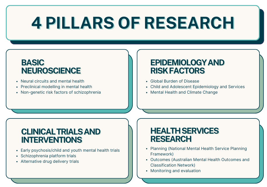 Our research teams are passionate about uncovering new insights into mental health, spanning everything from lab discoveries to real-world impact in clinics and communities. Guided by what matters most to people, and aligned with state and national priorities, we focus on:
